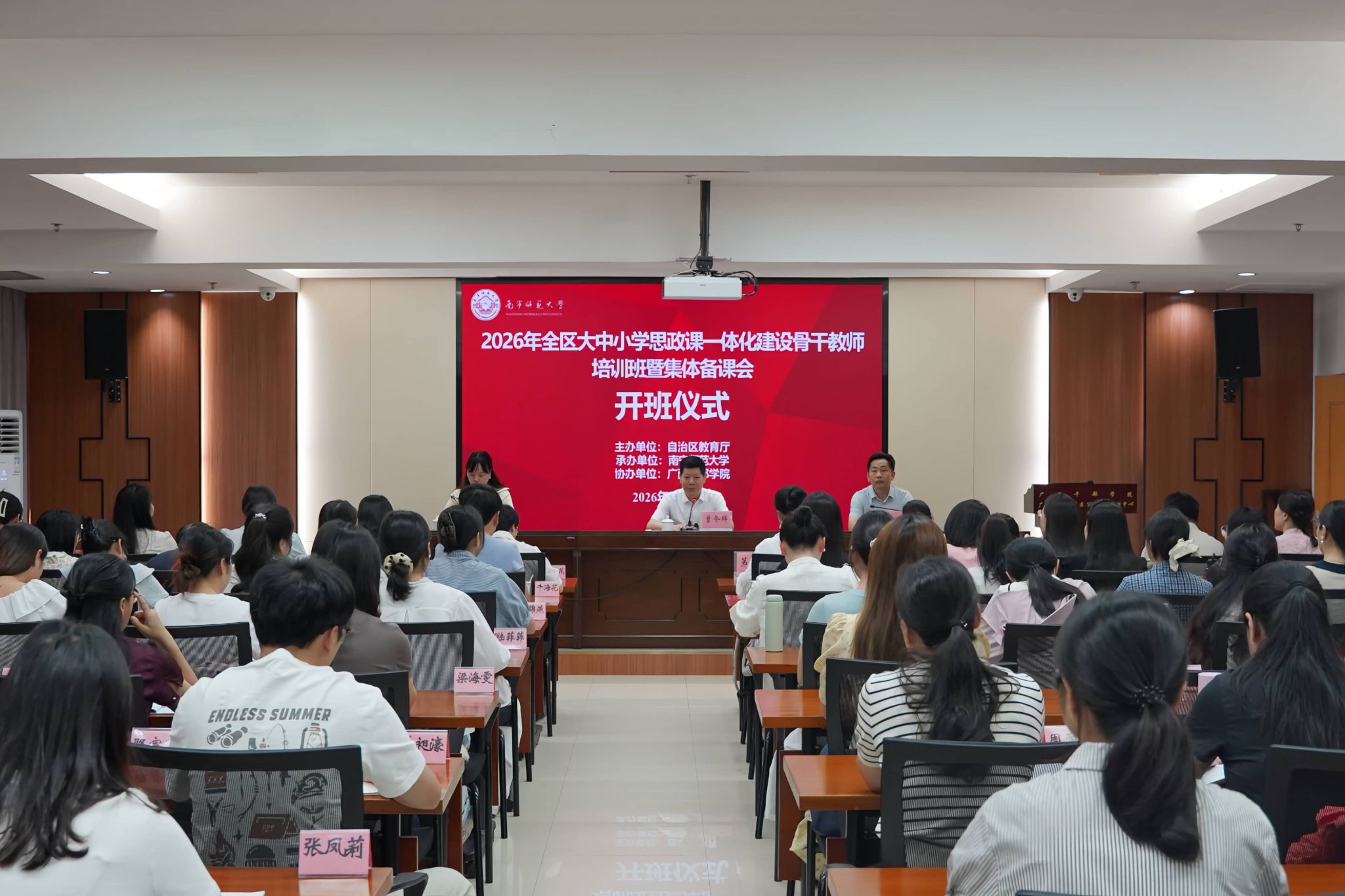 曾令辉在开班仪式上作动员讲话。他系统回顾了近年广西大中小学思政课一体化建设的成效与经验。他指出,培训班首次向县域延伸,推动县域中小学教师参与大中小学思政课一体化建设,探索构建整体联动、互通共享的资源共建共享长效机制。本次培训班坚持问题导向,聚焦学段衔接、资源共享、县域覆盖等难点与堵点,推动构建上下贯通、区域协同的思政教育一体化格局。他还介绍了培训班课程设计和培训纪律要求,要求学员严格遵守学员守则,做到学有所思、学有所获、学有所行,将培训成果转化为今后的工作实效。