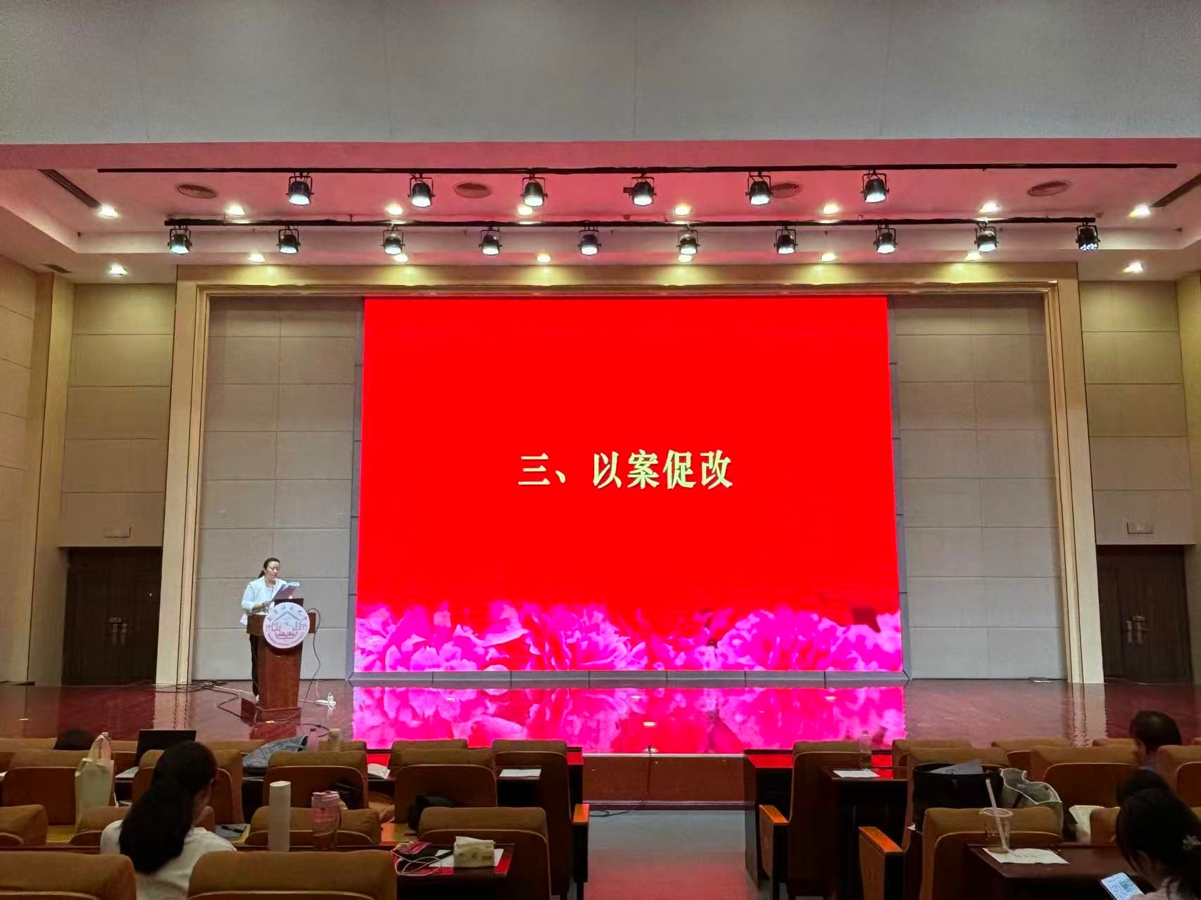在五合校区文综楼114报告厅召开“以案促改”警示教育大会,全体教工党员参加会议,会议由学院党委书记李玲主持。